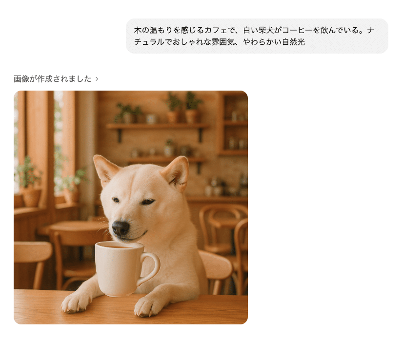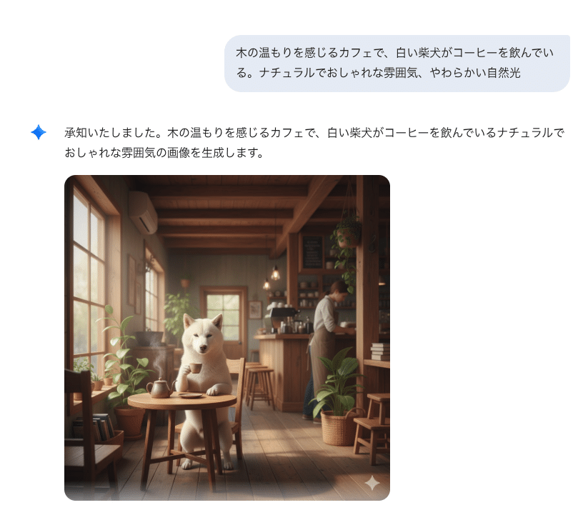 「木の温もりを感じるカフェで、白い柴犬がコーヒーを飲んでいる。ナチュラルでおしゃれな雰囲気、やわらかい自然光。」