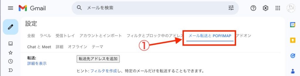 手順④:「メール転送とPOP/IMAP」を開く