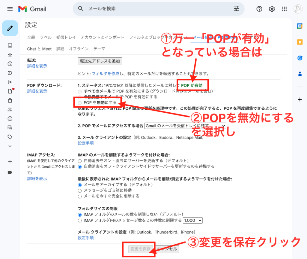 POPが無効になっている状態から有効にしてしまうと、全てのメールのダウンロードができるまで、変更を保存できなくなるので注意が必要