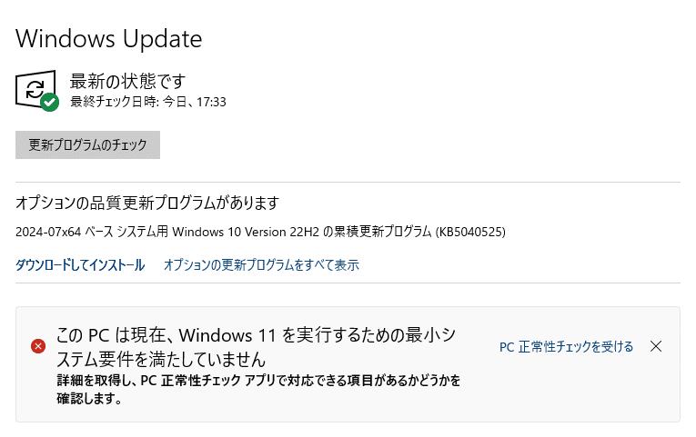 そもそもWindows11にアップグレードできるかを確認します。スペックが要件に満たしていない場合、そのPCはアップグレードできません。