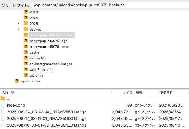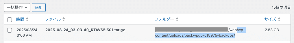ダッシュボードのBackWPup>バックアップの画面から、フォルダ、バップアップファイルの名前を確認できる⬇︎